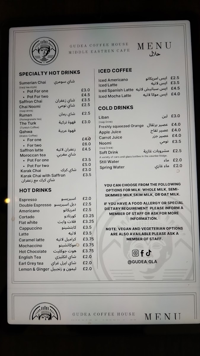 Welcome to Gudea Coffee House, a hidden gem located at 121 St George's Rd, Glasgow. This charming café boasts an impressive selection of coffee and tea, including must-try specialties like Turkish coffee and Iraqi tea, praised for their exceptional flavors. The atmosphere here is warm and inviting, adorned with lovely decorations that create a cozy space perfect for relaxation or study.